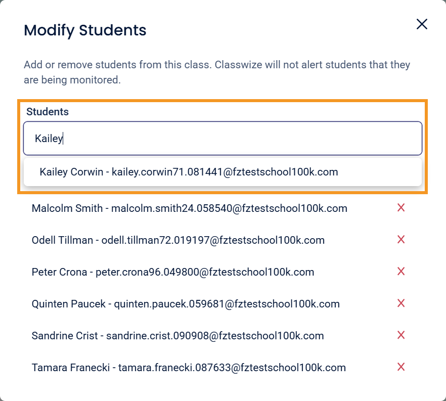 - On the My Classes Dashboard, select the Modify Students icon on the relevant Class tile. The Modify Students dialog will appear.